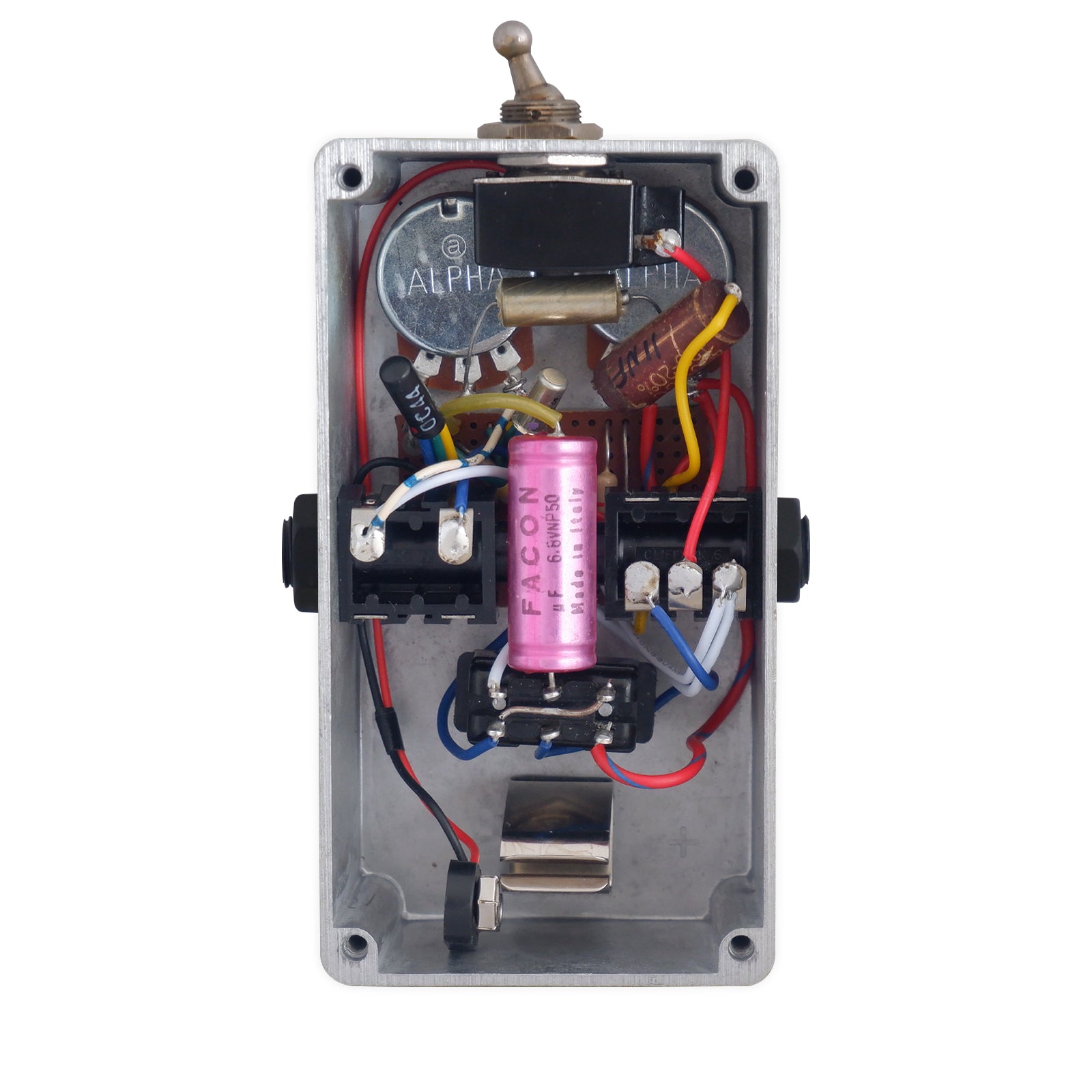 At the heart of the TeleFuzz are NOS OC45 and NKT274 PNP germanium transistors, paired with original-era capacitors and resistors for an authentic vintage voice. The result is a fuzz that feels remarkably alive under the fingers, reacting instantly to picking dynamics and guitar volume adjustments.